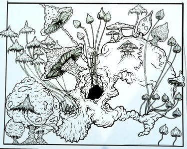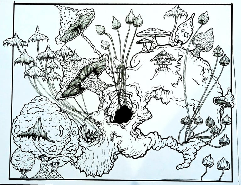 Lastly, the skull and mushrooms coffee table expands upon the aesthetic themes present in the earlier works. Crafted from sustainably sourced wood and adorned with striking illustrations, this table combines functionality with artistic expression. The mushrooms, depicted in a mesmerising style, symbolise both mystique and nature's beauty. This unique piece serves as an exquisite focal point in any room, effortlessly drawing attention and admiration.